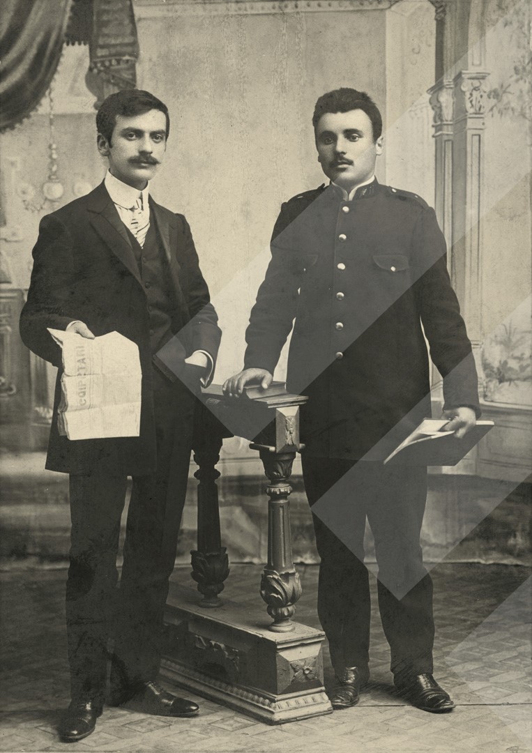 I panjohur, 1911, Majtas Hilë Mosi me gazetën "Sqiptari" në duar dhe Ismail Haki Dibra, kryeinspektor i Komisionit për mbrojtjen e bujqësisë në bursa, print në letër, 10 x 14 cm.
