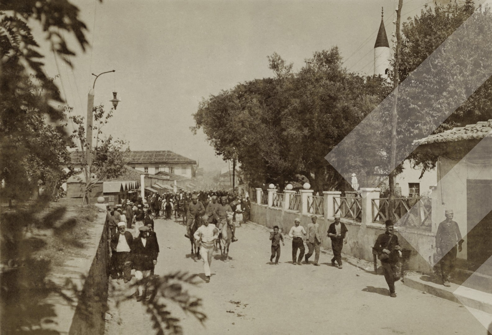 I panjohur 1914, Trupat e armatorura rebele duke hyrë në Durrës më 5 shtator 1914.(Kryengritja e Shqipërisë së Mesme), print në letër, 12 x 16 cm.