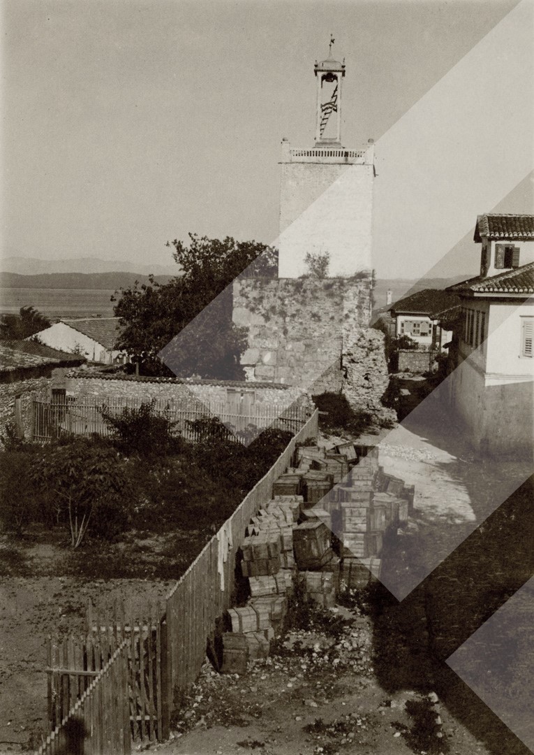 I panjohur 1914, Pamje nga Durrësi. Kambanorja e qytetit në vitin 1914, print në letër, 7 x 10 cm.