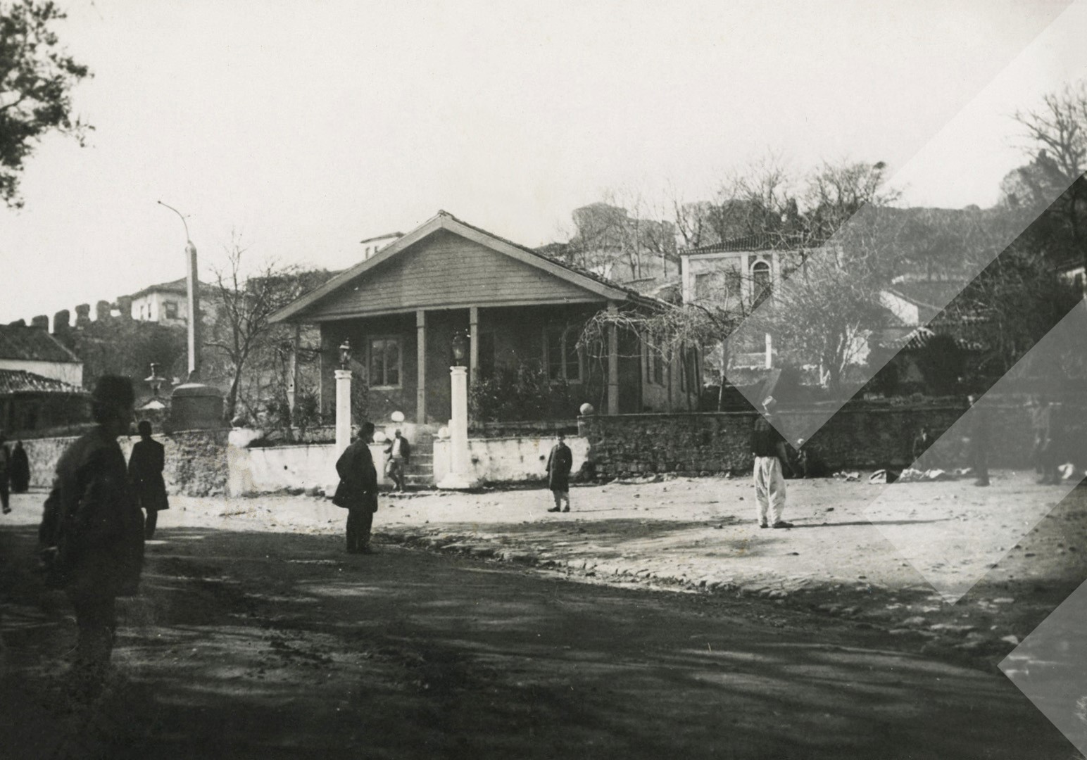 I panjohur, Rreth 1900-1910, Karakolli i xhandarmërisë në Varosh. Një pjesë e tregut të kalasë para Bashkisë, Durrës, print në letër, 12 x 17 cm.