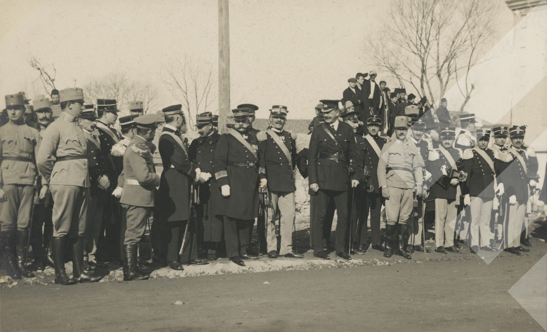 I panjohur 1913, Përfaqësuesit e fuqive të mëdha ndjekin një parakalim ushtarak. (në qendër koloneli Philips, guvernatori provizor i Shkodrës), Print në letër, 9 x 14 cm.