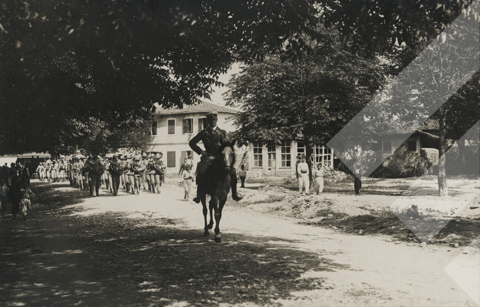 I panjohur 1913, Hyrja e marinarëve gjermanë në Shkodër, pjesë e pranisë ushtarake të fuqive të mëdha, Print në letër, 9 x 14 cm.