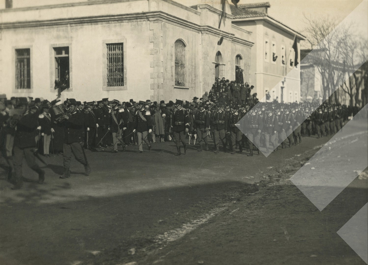 I panjohur 1913, Parakalim i trupës italiane në Shkodër, pjesë e pranisë ushtarake të fuqive të mëdha, Print në letër, 9 x 14 cm.
