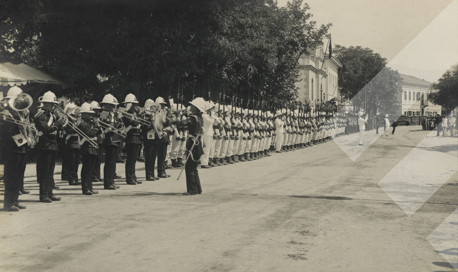 I panjohur 1913, Banda ushtarake dhe trupa franceze në revistë, Shkodër, Print në letër, 9 x 14 cm.