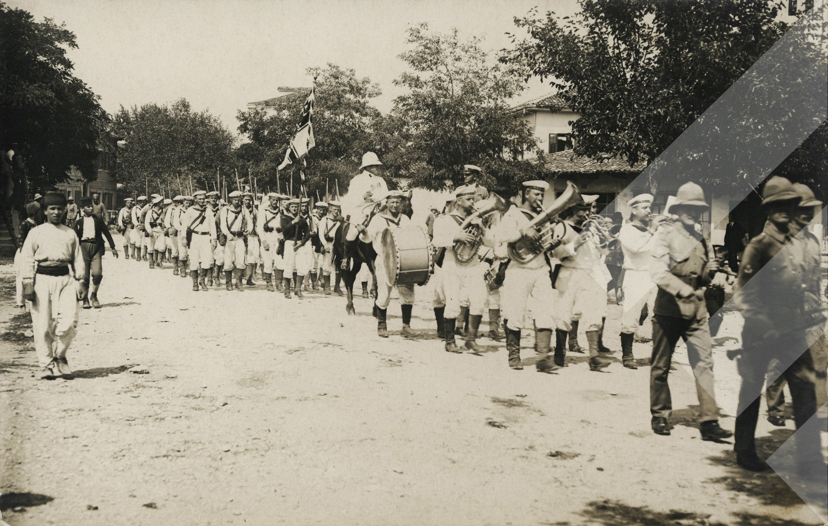 I panjohur 1913, Banda dhe tupa gjermane duke parakaluar në Shkodër, Print në letër, 9 x 14 cm.