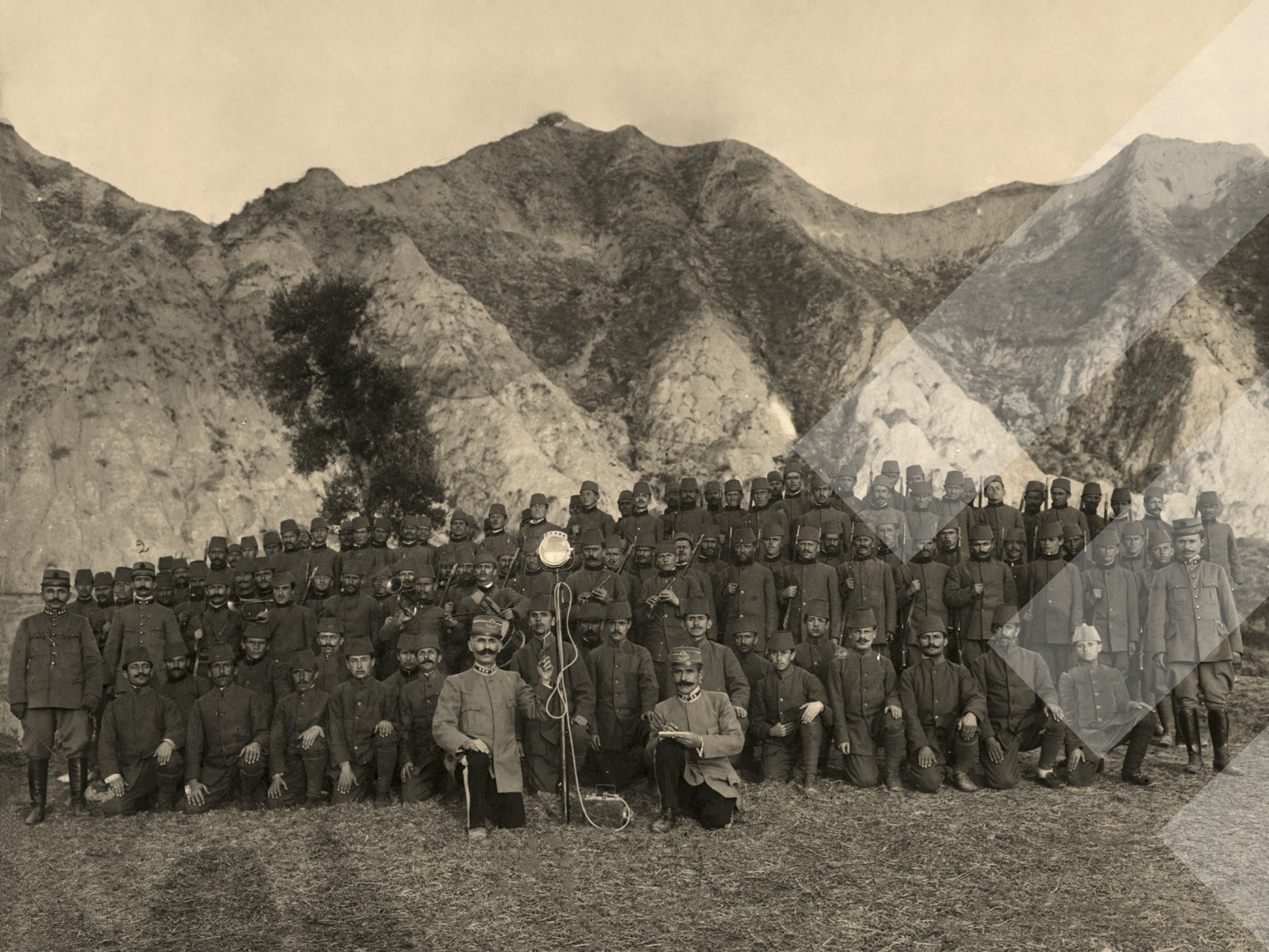 I panjohur 1914, Detashmenti shqiptar i Gjirokastrës me në qendër grupin e telegrafistëve, print në letër, 18 x 23 cm.