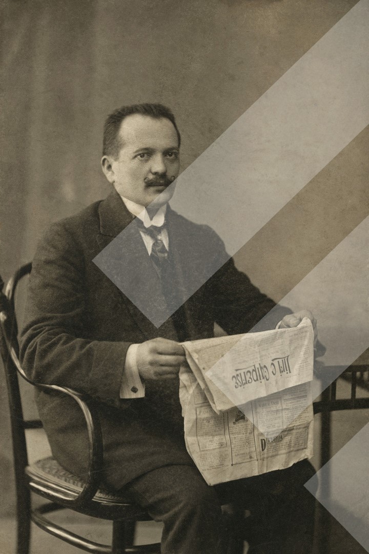 I panjohur 1913, Jorgaq Buçiu duke pozuar me gazetën, print në letër, 10 x 15 cm.