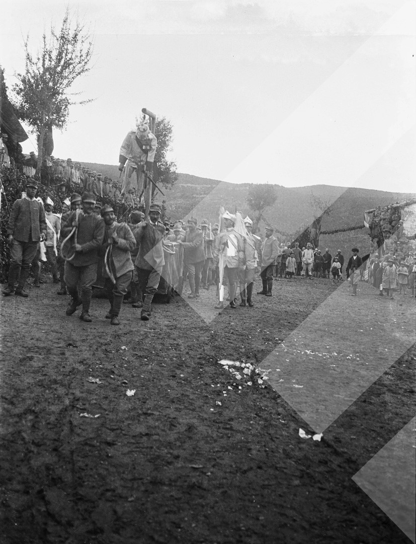 I panjohur, 1916, Kukulla e perandorit Franc Jozef varet nga ushtarë italianë në Vlorë, negativ, 8 x 10.5 cm.