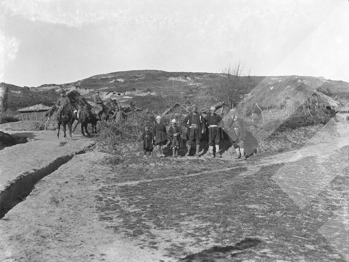 I panjohur, 1916, Fshatarë para kasolleve të tyre dhe oficerë italianë mbi kuaj, në zonën italiane të pushtimit, negativ, 8.5 x 11 cm.