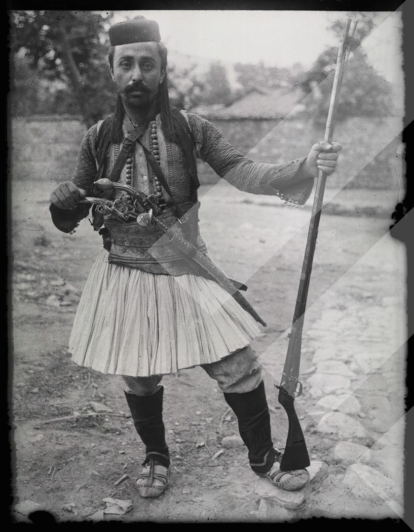 I panjohur, 1918, Burrë i armatosur me veshjen e Elbasanit, Pllakë xhami, 9 x 12 cm.