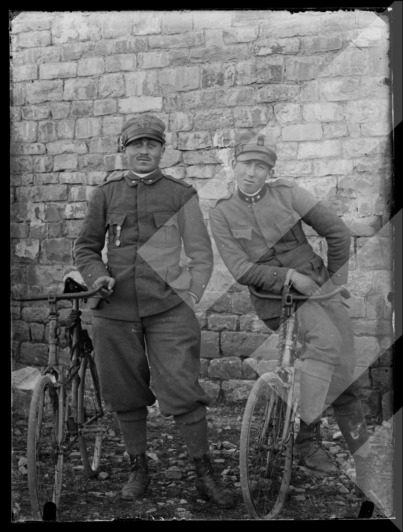 Dhimitër Vangjeli, rreth 1916-1917, Dy bersalierë të Luftës I Botërore pozojnë me biçikletat e tyre, Ersekë, pllakë xhami, 9 x 12 cm.