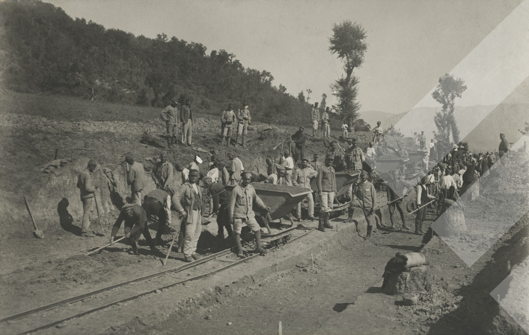 I panjohur, rreth 1916-1918, Trupat austro-hungareze në Luftën I Botërore duke punuar për hapjen e rrugës së dekovilit, Print në letër, 9 x 11 cm.