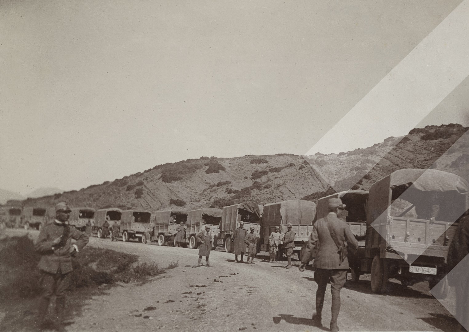 I panjohur , "", 1918 , , Autokolonë me kamionë të ushtrisë italiane në pushim, në Kalpaq, Janinë, , Print në letër , 8 x 11 cm