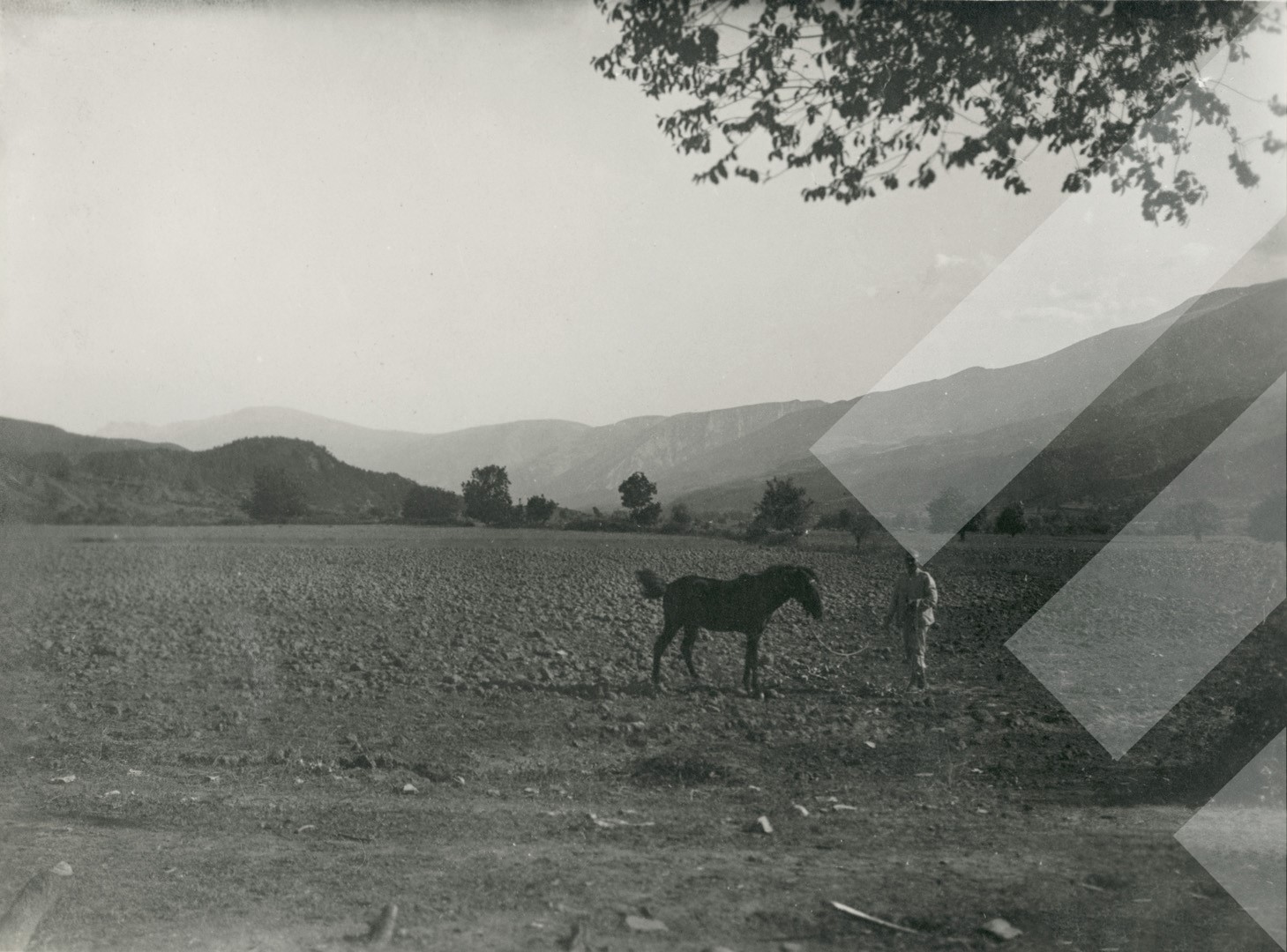 I panjohur, 1917, Ushtar me kalin e tij Piero në fshatin Ballaban, Këlcyrë. Në sfond malet e Trebeshinës dhe Nemërçkës., Print në letër, 11.5 x 8.5 cm.