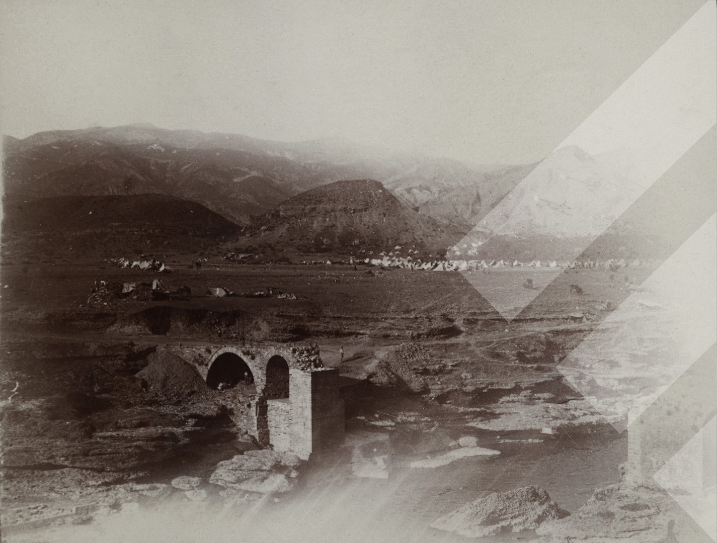 I panjohur, 1917, Ura e shkatëruar e Përmetit gjatë Luftës së I Ballkanike dhe fushimi i regjimentit 203 të fanterisë italiane, Print në letër, 8 x 10.5 cm.