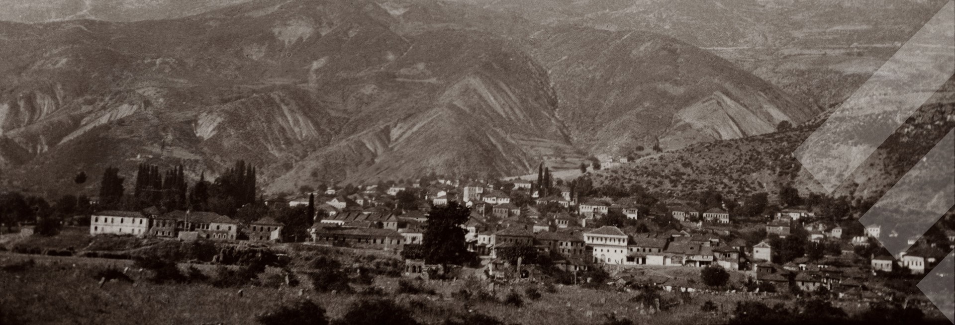 I panjohur 1917, Pamje panoramike e qytetit të Përmetit. Në sfond Mali i Dhëmbelit, Print në letër, 4.5 x 11 cm.