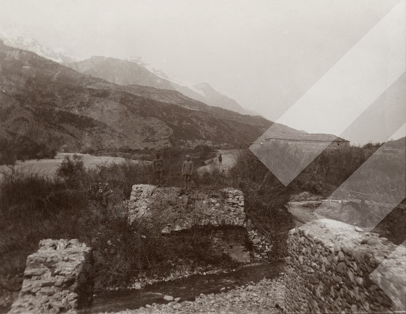 I panjohur , "", 1917-1918 , , Urë e shkatëruar e fshatit Seran mbi një degëzim të lumit Vjosa, , Print në letër , 8.5 x 10.7 cm