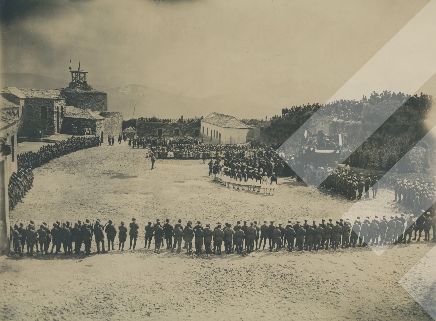 I panjohur, Ceremoni në kalanë e Gjirokastrës për përvjetorin e parë të shpalljes së Pavarësisë së Shqipërisë nën protektoriatin italian, nga gjenerali Giacinto Ferrero. 3 qershor 1918, Print në letër, 16 x 22.5 cm.