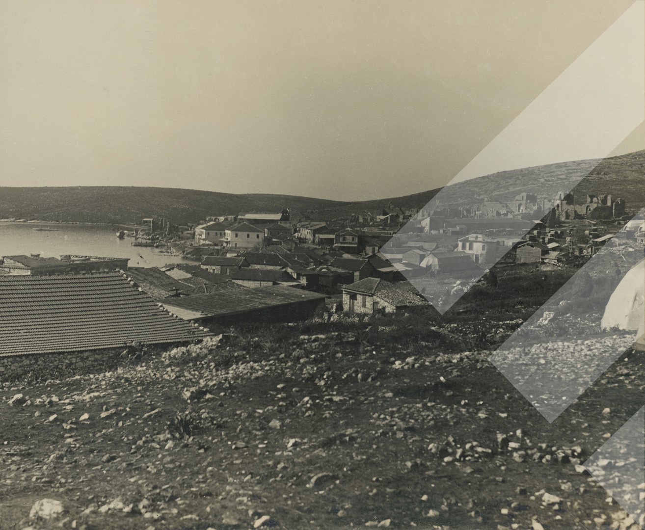 I panjohur , "", 1918 , , Pamje e shtëpive dhe kalasë mesjetare të Sarandës, , Print në letër , 11.5 x 14 cm