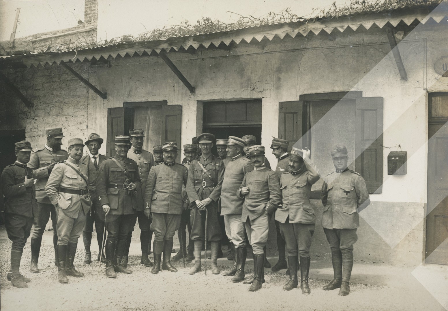 I panjohur, 1918, Komanda e trupave italiane në Sarandë, mes tyre oficer aleatë anglez dhe francez, Print në letër, 12 x 17 cm.