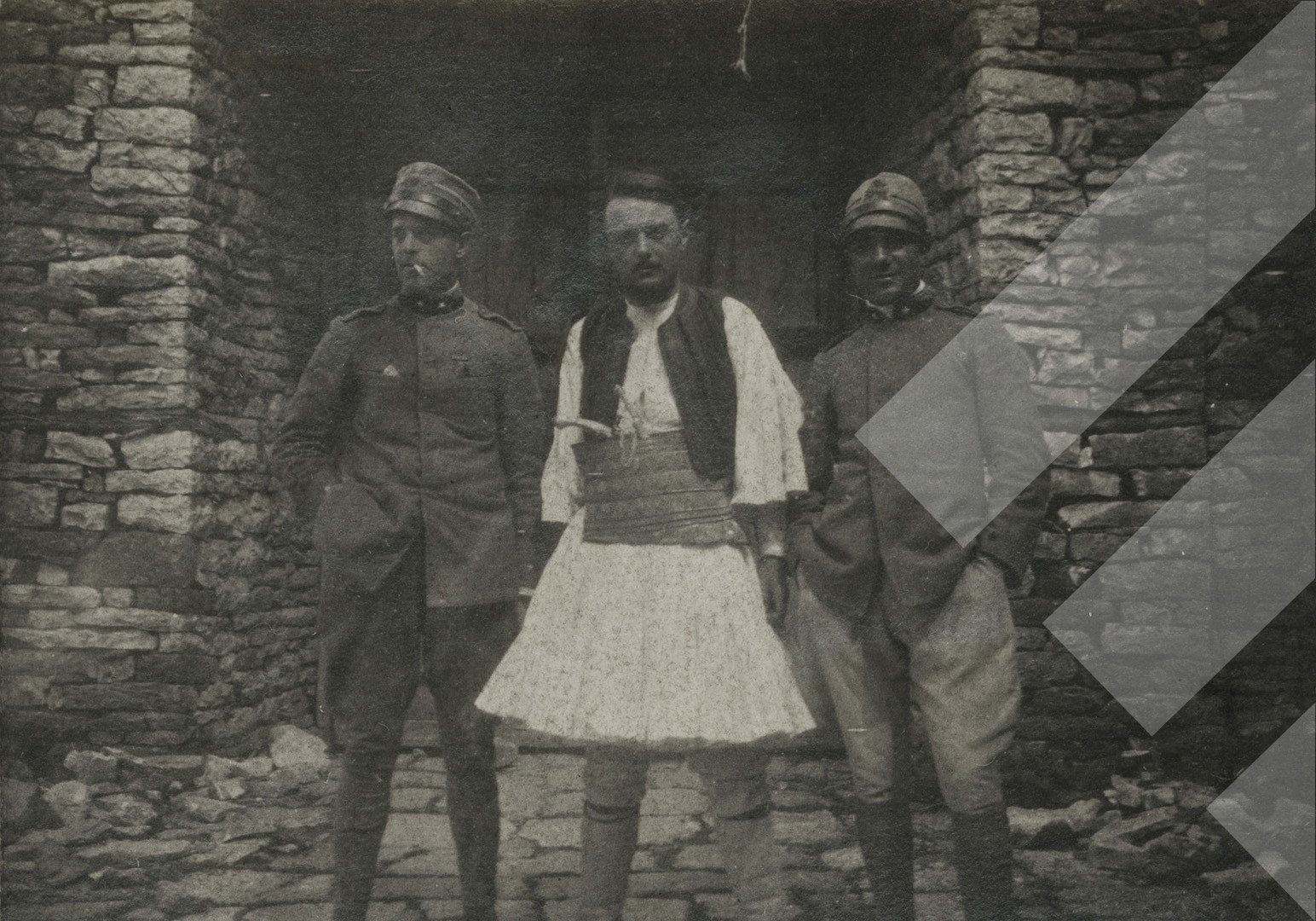 I panjohur , "", 1918 , , Ushtarë italianë duke pozuar. Ushtari në mes pozon me kostumin tradicional të zonës, , Print në letër , 4.5 x 6 cm