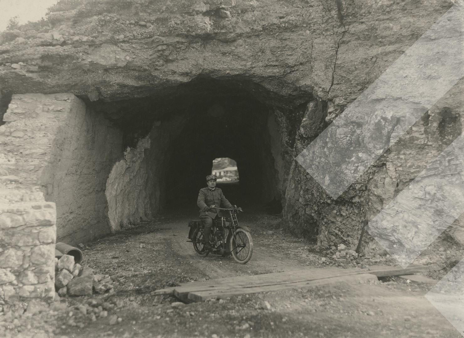 I panjohur , "", 1917 , , Motorçiklist italian duke pozuar në tunelin e sapohapur të Ujit të Ftohtë, Vlorë, , Print në letër , 16.5 x 22.5 cm