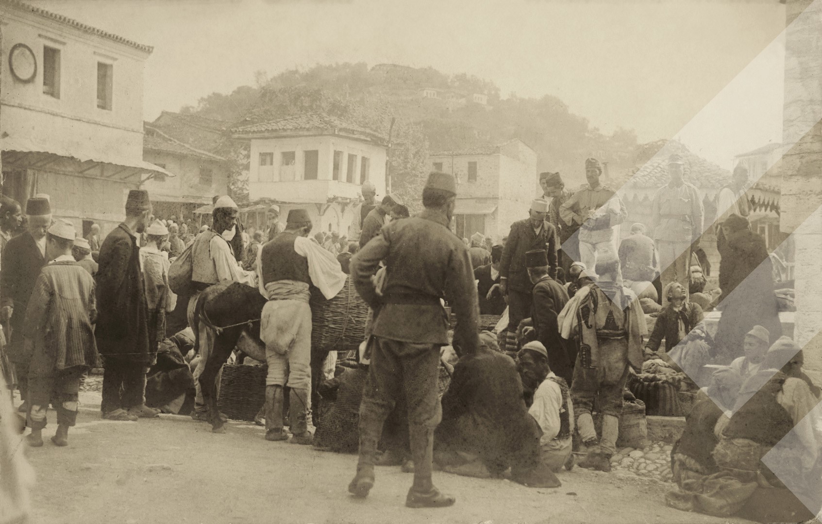 I panjohur , "", 1918 , , Ushtarë auastro-hungarezë në pazarin e Beratit, , Print në letër , 9 x 14 cm