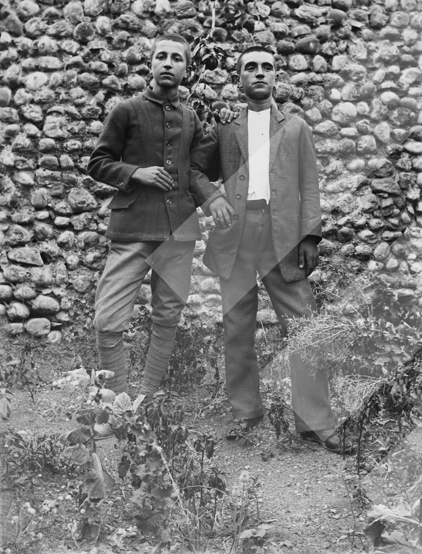 I panjohur, rreth 1915-1917, Dy të rinj shkodranë, pllakë xhami, 9 x 12 cm.