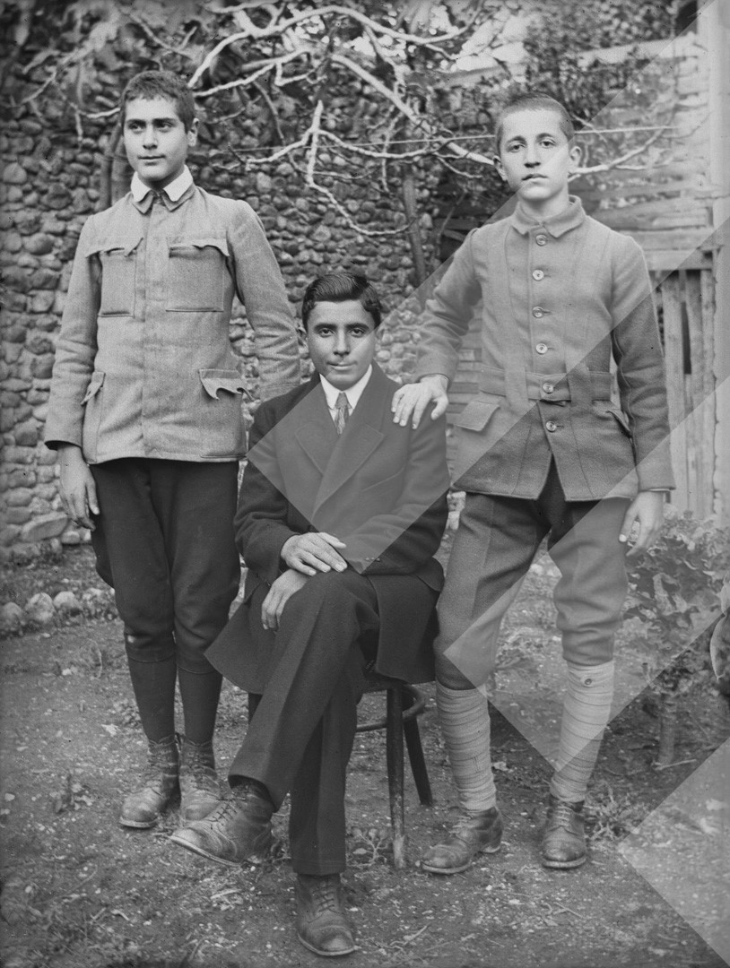 I panjohur, rreth 1915-1917, Tre të rinj në pozë, Shkodër, pllakë xhami, 9 x 12 cm.