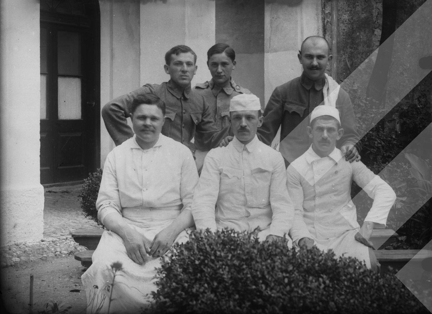I panjohur, rreth 1916-1917, Ushtarë austro-hungarezë me punonjës të mensës, Shkodër, pllakë xhami, 9 x 12 cm.