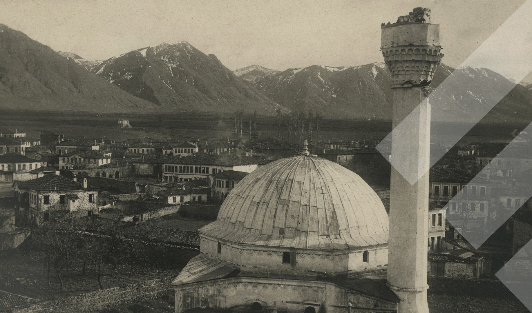 I panjohur , "", 1918 , , Pamje e minares së xhamisë së dëmtuar në qytetin e Korçës, , Print në letër , 7.5 x 13 cm