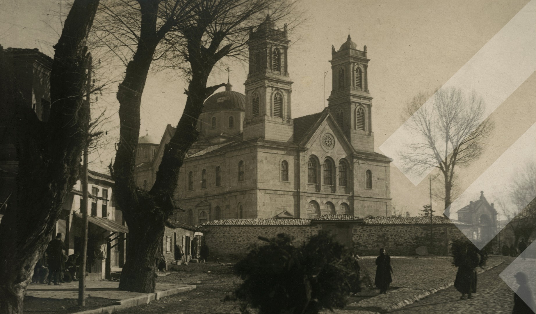 I panjohur, 1918, Pamje e katedrales orthodokse të Shën Gjergjit në qytetin e Korçës, Print në letër, 7.5 x 13 cm.