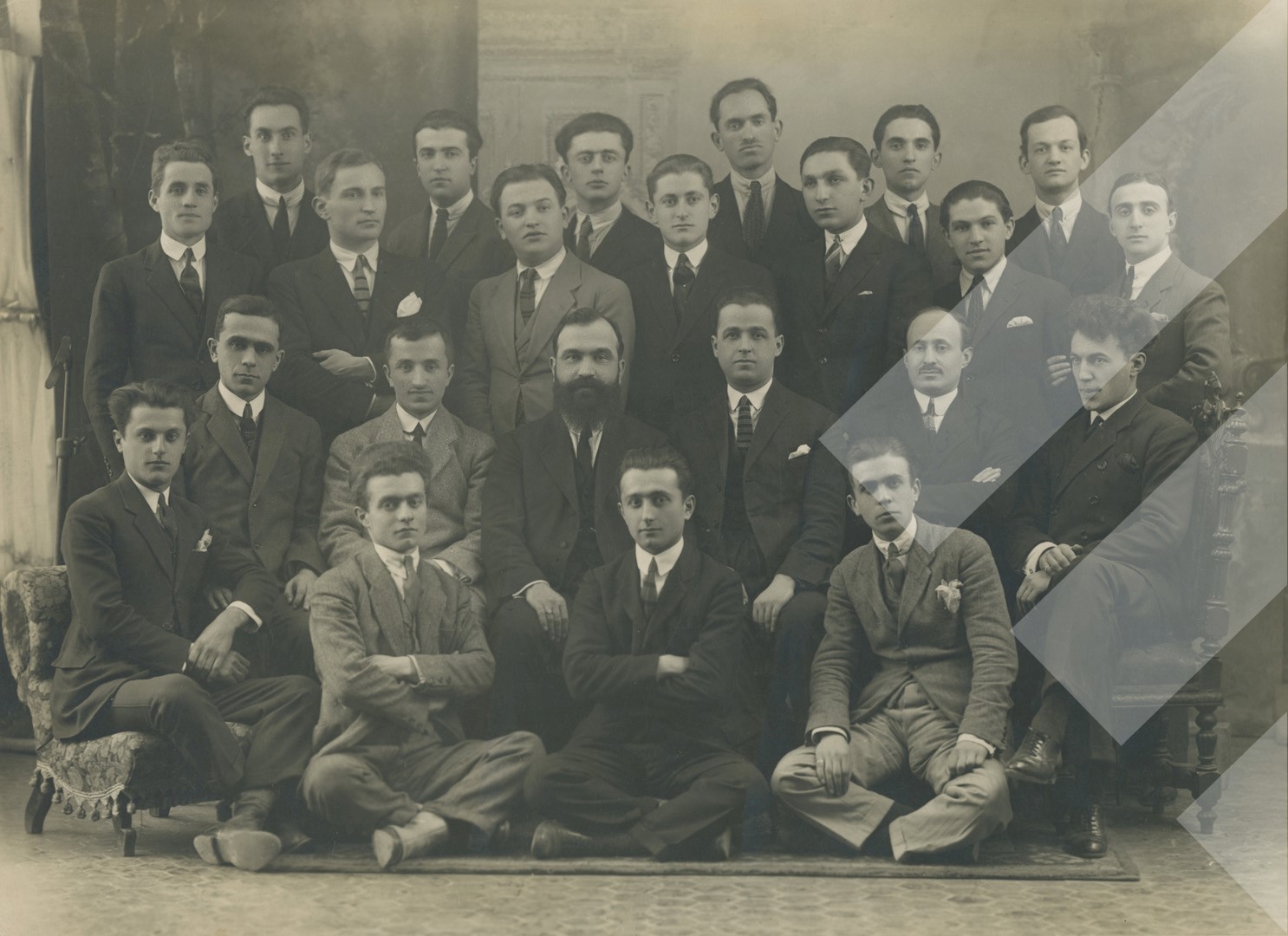 I panjohur, 1920, Fan Noli me të rinj shqiptarë në Romë. (Majtas tij Avni Rusteni, poshtë Sejfulla Malëshova), print në letër, 17 x 23 cm.