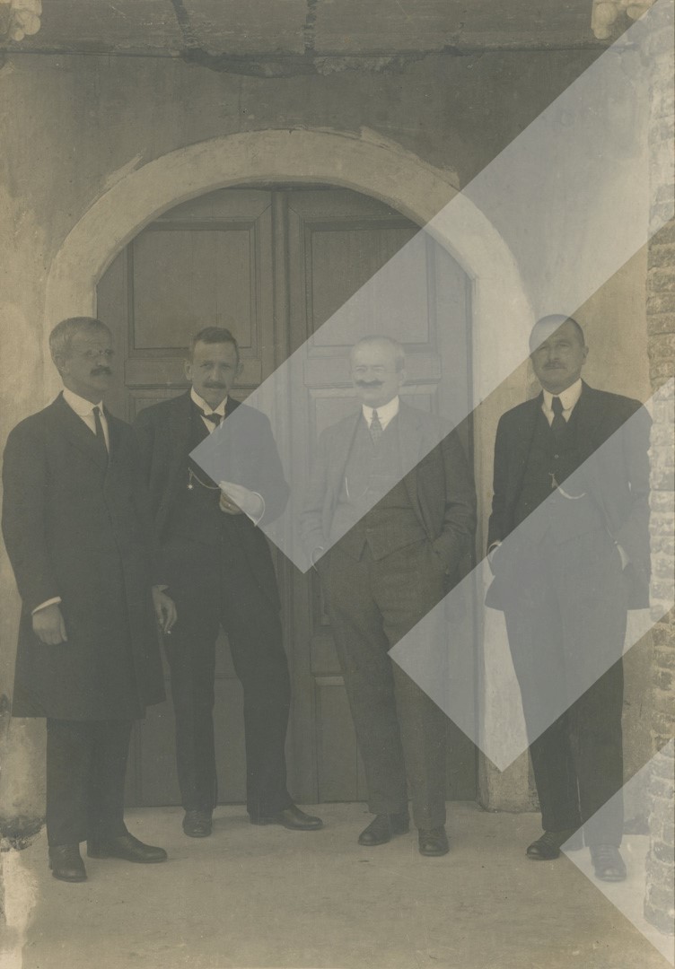 Kol Maca, 1922, Antarët e Këshiliit të Naltë të Shtetit Shqiptar. Nga e majta; Sotir Peci, Gjon Çoba, Xhafer Ypi, Refik Toptani, print në letër, 9 x 14 cm.
