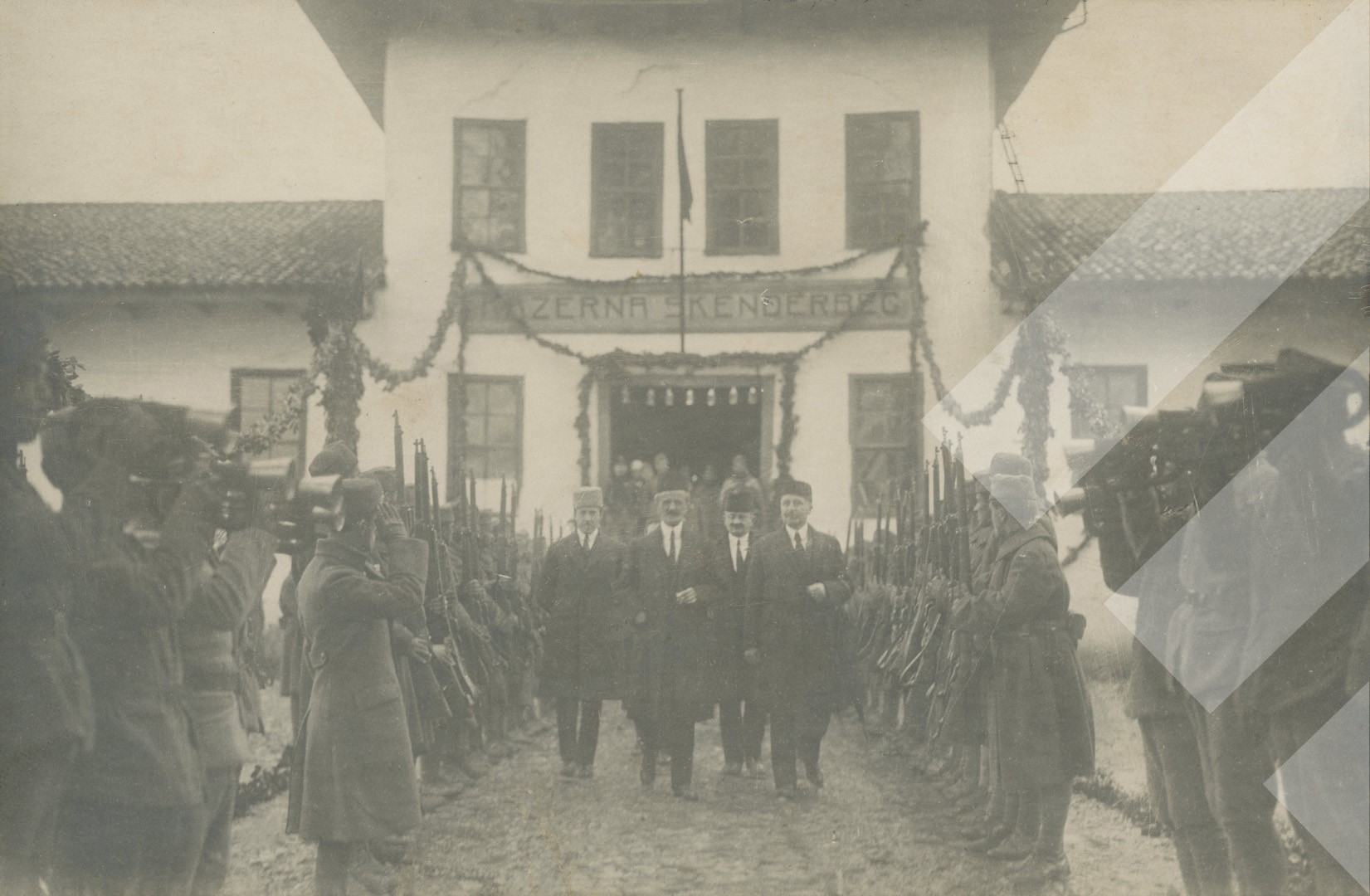 Kol Maca, 1922, Antarë të Këshillit të Naltë të shtetit Shqiptar dalin nga kazerma "Skanderbeg" në Tiranë, print në letër, 9 x 14 cm.