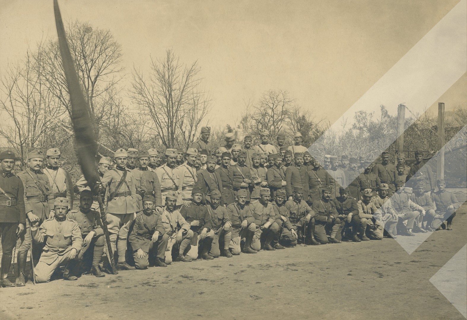 I panjohur, 1920, Grup oficerësh shqiptarë dalë në kazermën e Rrugës së Kavajës, print në letër, 12 x 17 cm.