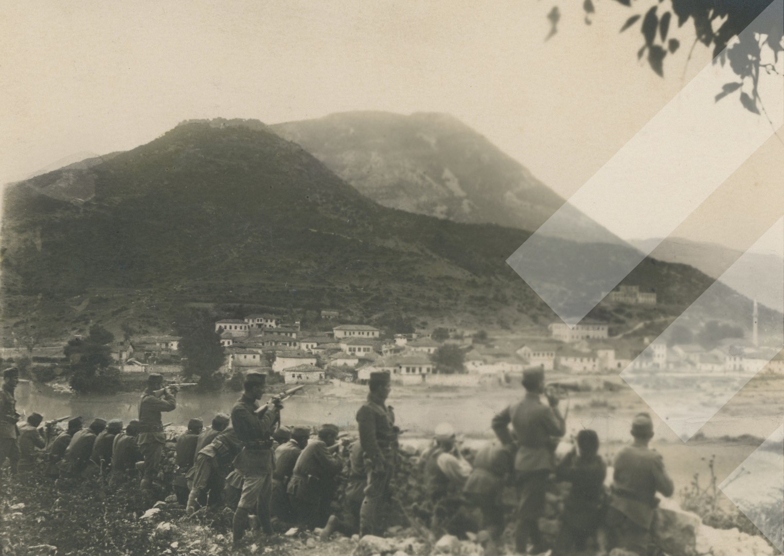 Kol Maca, 1921, Forca qeveritare në luftime me kryengritës në Lezhë, më 1921, print në letër, 9 x 14 cm.