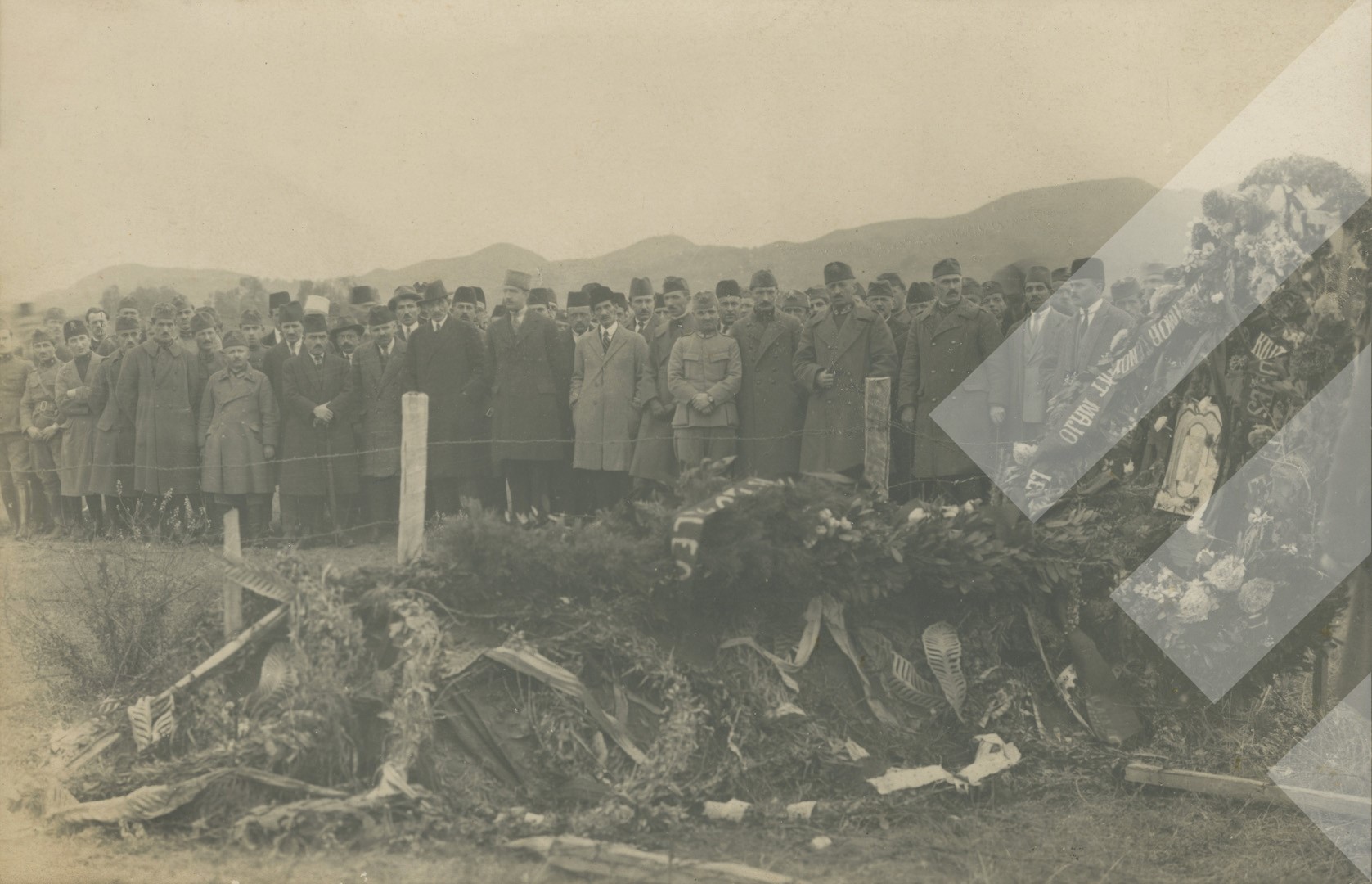 Kol Maca, 1922, Ceremonia e varrimit të Majorit Meleq Frashëri. Vrarë më 8 Mars të vitit 1922 nga forcat rebele gjatë grushtit e shtetit, print në letër, 9 x 14 cm.