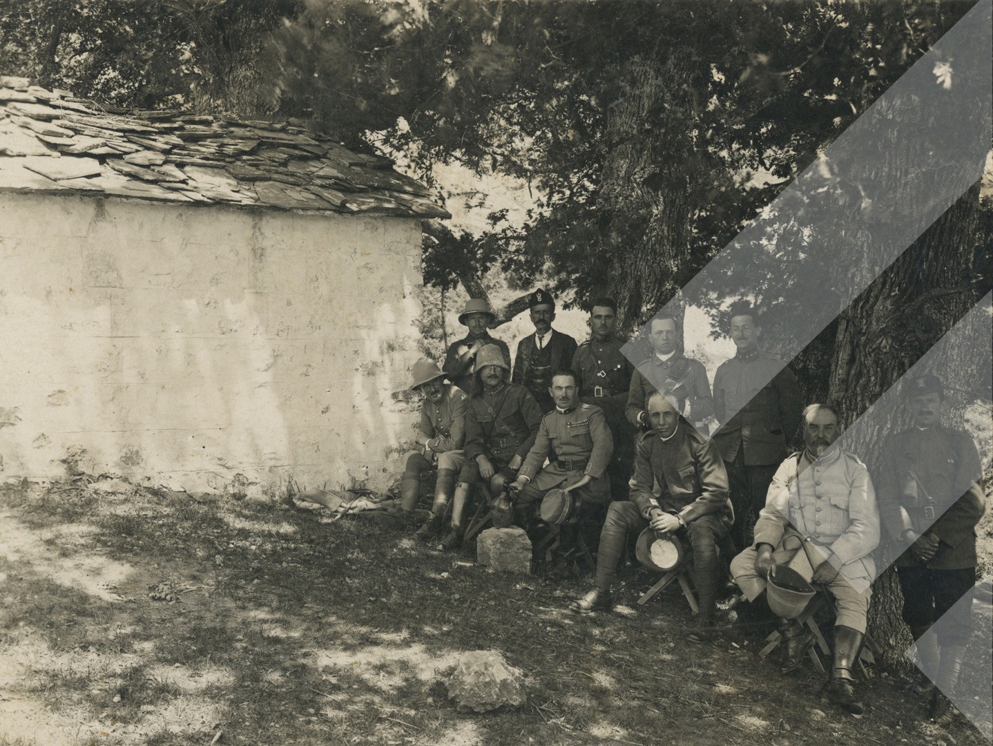 I panjohur, rreth 1922-1923, Gjenerali Italian Enrico Tellini (në qendër) Kryetar i Komisionit të caktimit të kufijve të Shqipërisë, print në letër, 9 x 14 cm.