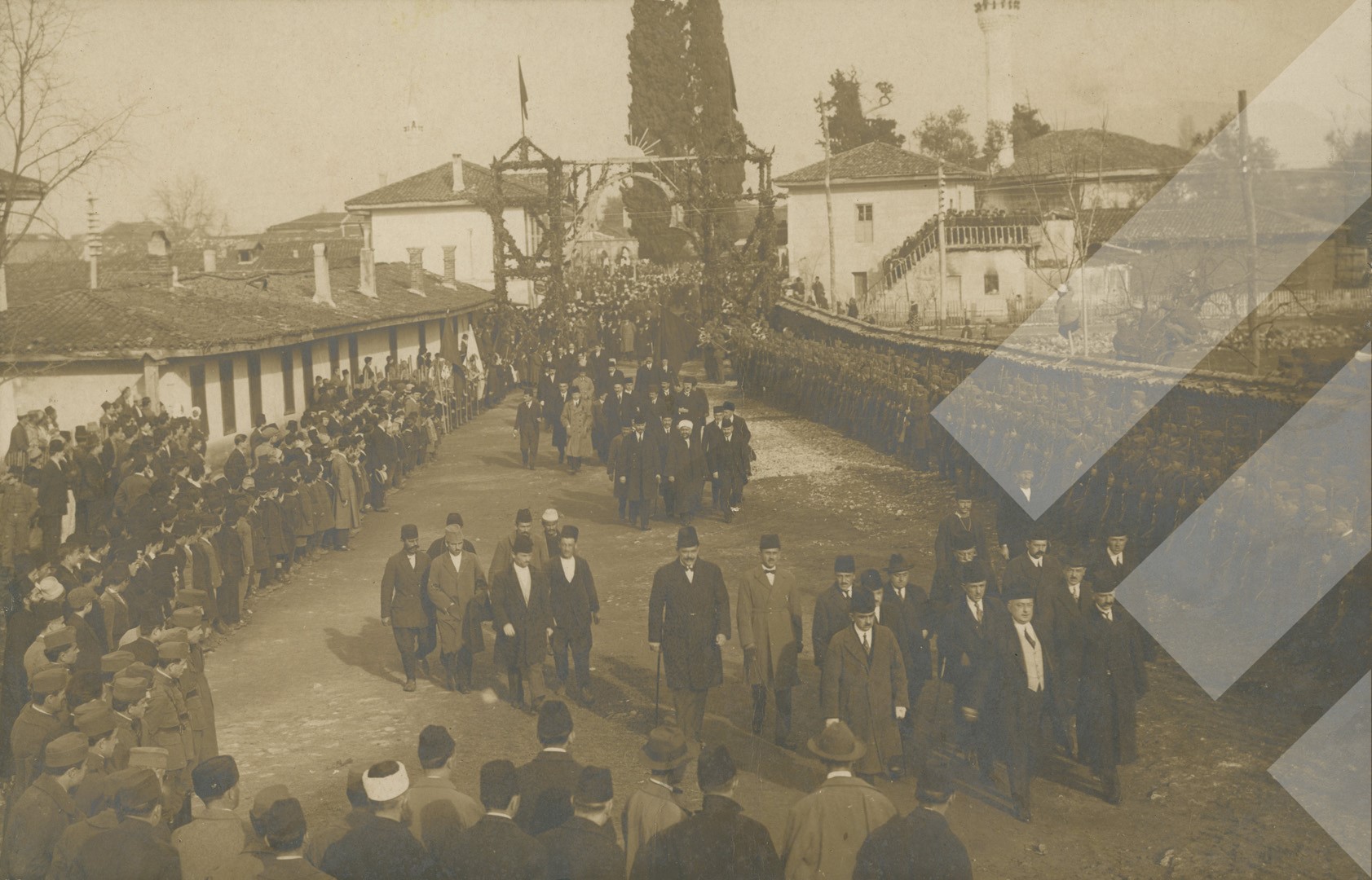 Kol Maca, 1924, Deputetët e Beratit, Dibrës dhe Durrësit duke hyrë në godinën e Parlamentit në ditën e çeljes së Asamblesë Kushtetuese, 21 janar 1924, print në letër, 9 x 14 cm.