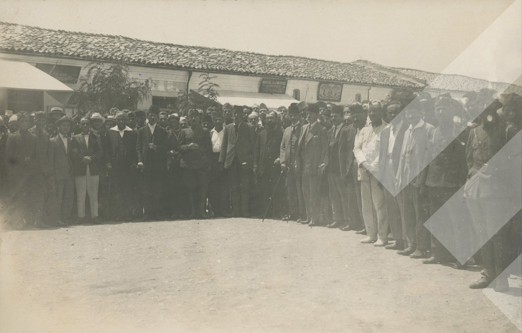 Kol Maca, 1924, Kryeministri Fan Noli me një grup mbështetësish të qeverisë së tij. Në qendër të fotos Kryepeshkopi Noli, në të djathtë, print në letër, 9 x 14 cm.
