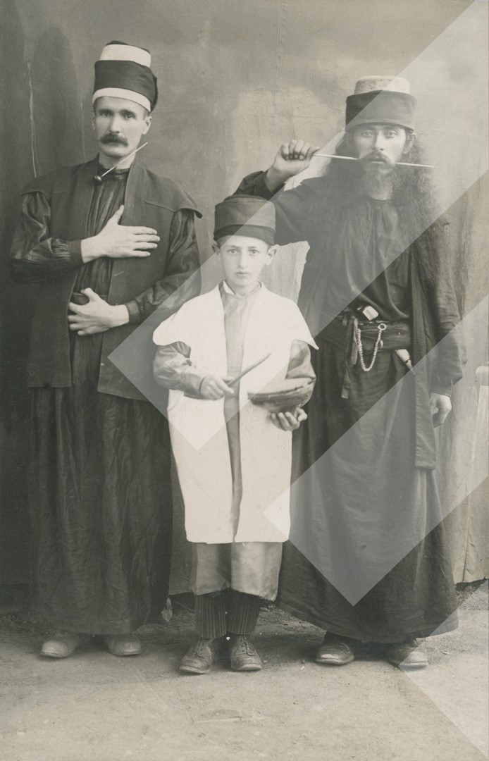 Kol Maca, 1927, Dervishë të urdherit Rufai pas ritualit të shpimit të fytyrës dhe qafës. Tamburi në duart e fëmijës shërbente për të mbajtur ritmin e ritualit, print në letër, 9 x 14 cm.