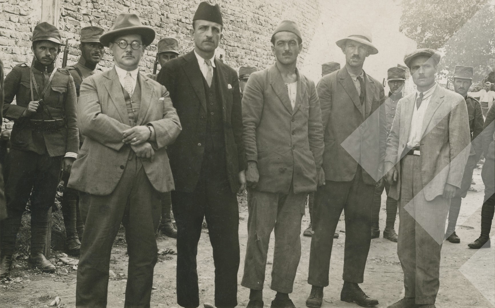 Kol Maca, 1928, Nga e majta në të djathtë: Teodor Vullkanov, Ibrahim Arapi, Haxhi Murati, Teodor Gjeorgjev, përpara dënimit me varje në 12 korrik 1928 në sheshin e tregut në Tiranë, print në letër, 9 x 14 cm.