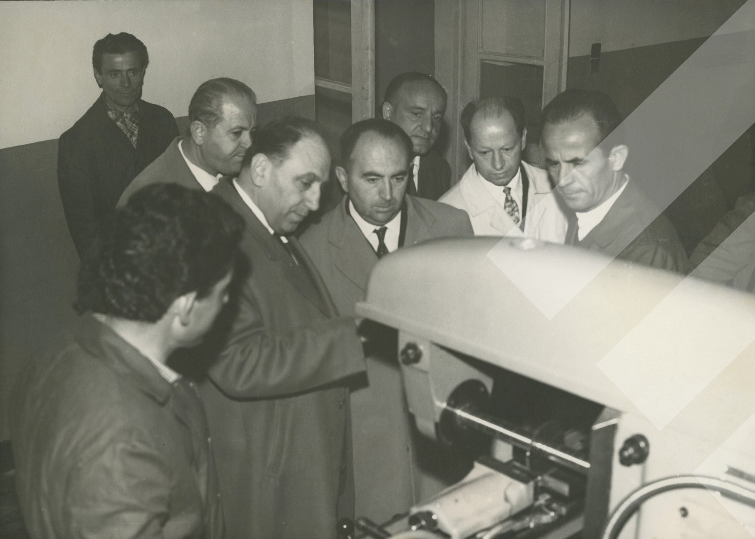 I panjohur, 1967 Zv.kryeministri Adil Çarçani dhe kryetari i Komitetit Ekzekutiv të Tiranës Abdyl Këllezi gjatë vizitës në një nga repartet e uzinës print në letër, 13 x 18 cm.