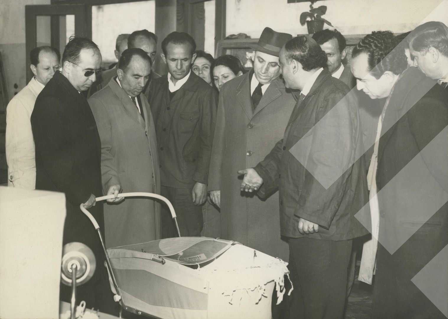 I panjohur, 1967 Zv.kryeministri Adil Çarçani dhe kryetari i Komitetit Ekzekutiv të Tiranës Abdyl Këllezi vështrojnë një karrocë për fëmijë, prodhim i uzinës print në letër, 21 x 27 cm.