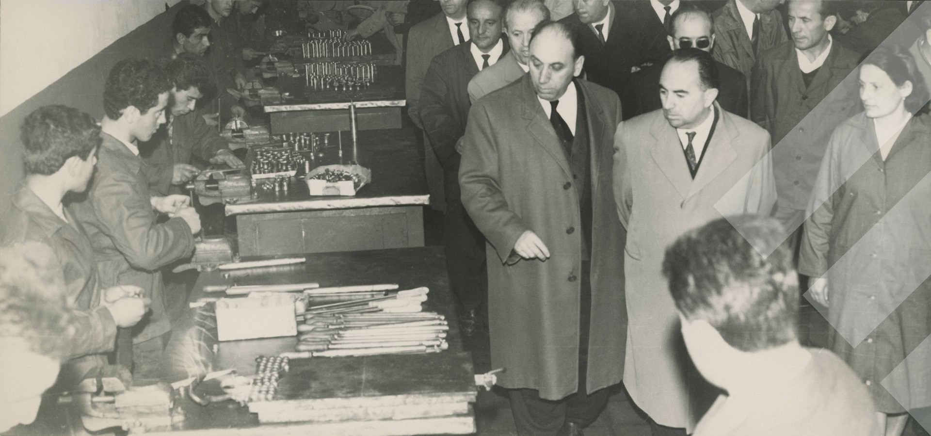 I panjohur, Zv.kryeministri Adil Çarçani dhe kryetari i Komitetit Ekzekutiv të Tiranës Abdyl Këllezi gjatë vizitës në repartin e prodhimit të veglave të punës në uzinën print në letër, 9 x 18 cm.