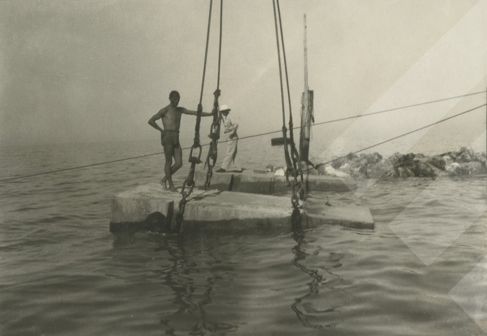 I panjohur , "", 1931 , , Montimi i kubeve të betonit për dallgëthyesin, , print në letër , 6 x 8 cm