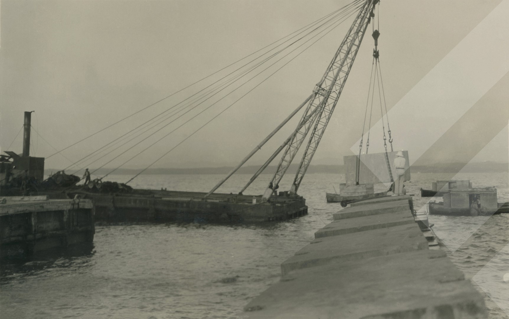 I panjohur , "", 1931 , , Montimi i kubeve të betonit për dallgëthyesin, , print në letër , 9 x 14 cm