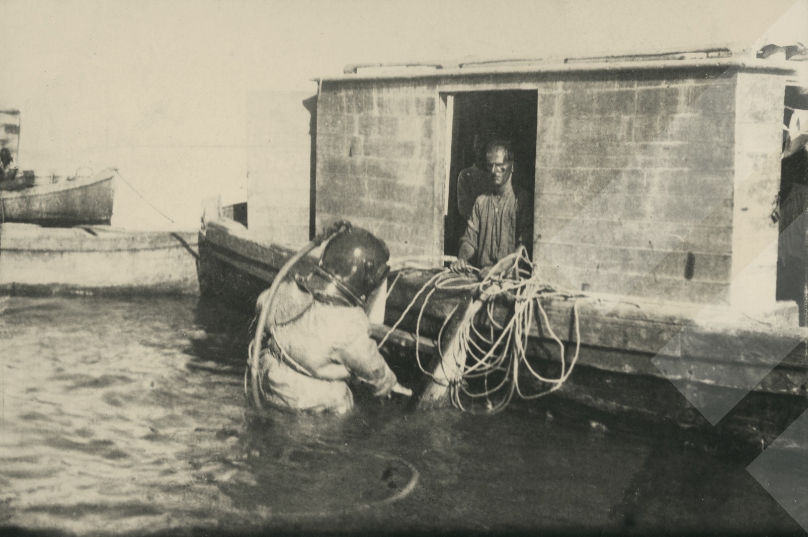 I panjohur , "", 1932 , , Palombar për të minuar mbetjet e piroskafit "Lokrum" gjatë punimeve në port, , print në letër , 6 x 8 cm