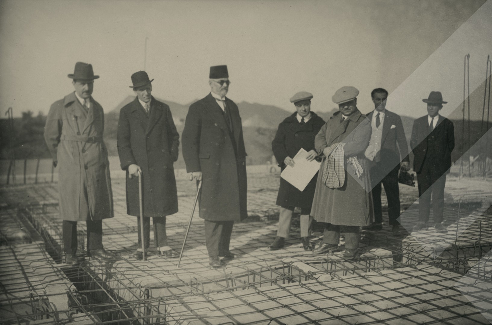 Fotografia Gurashi , "", 1929 , , Qeveritarë Shqipëtarë dhe përfaqsues së kompanisë së ndërtimit inspektojnë urën e Rogozhinës, , print në letër , 9 x 13 cm